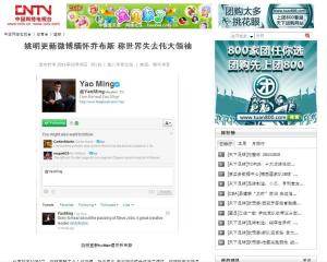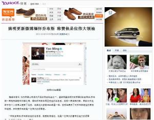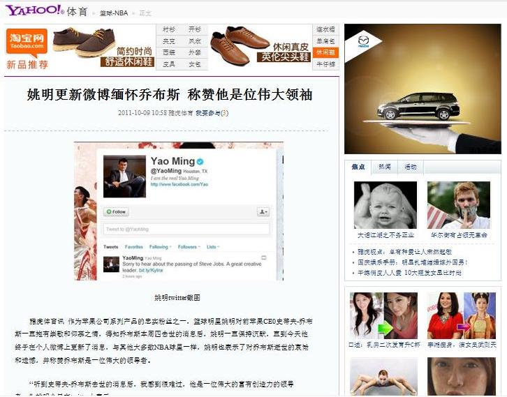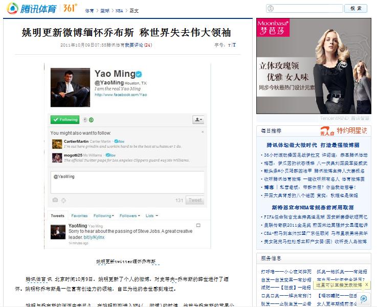 Although Twitter is officially blocked in China, Yao’s tweet immediately caught the Chinese national media attention. Within only a few hours, Yao’s tweet on Steve Job’s passing became one of the top news on the sports section of almost all the top Chinese websites.