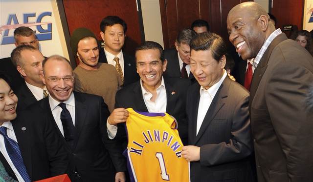 Chinese Vice President Xi Jinping wrapped up his five-day visit to the U.S. on Feb 17th at Staples Center, where he attended a Los Angeles Lakers-Phoenix Suns basketball game, where he was presented with a jersey with his name on it in the company of Lakers legend Magic Johnson, soccer star David Beckham and Los Angeles Mayor Antonio Villaraigosa. http://on.msnbc.com/xRbIb6